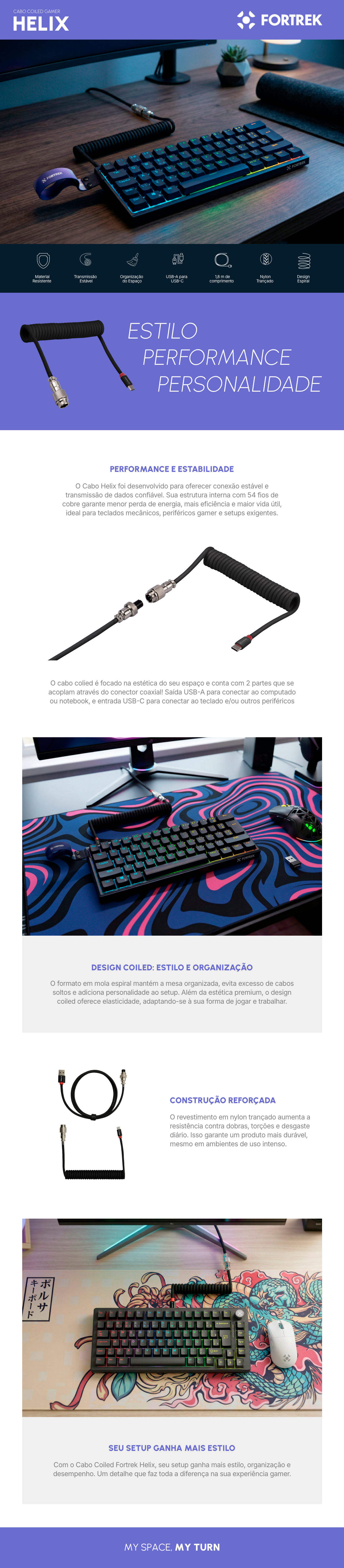Já o seu formato em mola espiral (coiled) mantém a mesa mais organizada, evitando excesso de cabos soltos e trazendo um visual mais clean e profissional ao setup. Se você busca um cabo espiral USB-C gamer resistente no estilo coiled para teclado mecânico, o cabo Fortrek Helix é a escolha ideal.