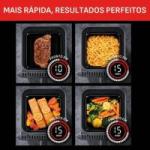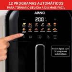 Para facilitar ainda mais o uso, o modelo conta com 12 programas automáticos, que ajustam tempo e temperatura conforme o tipo de alimento, tornando o preparo simples e preciso.