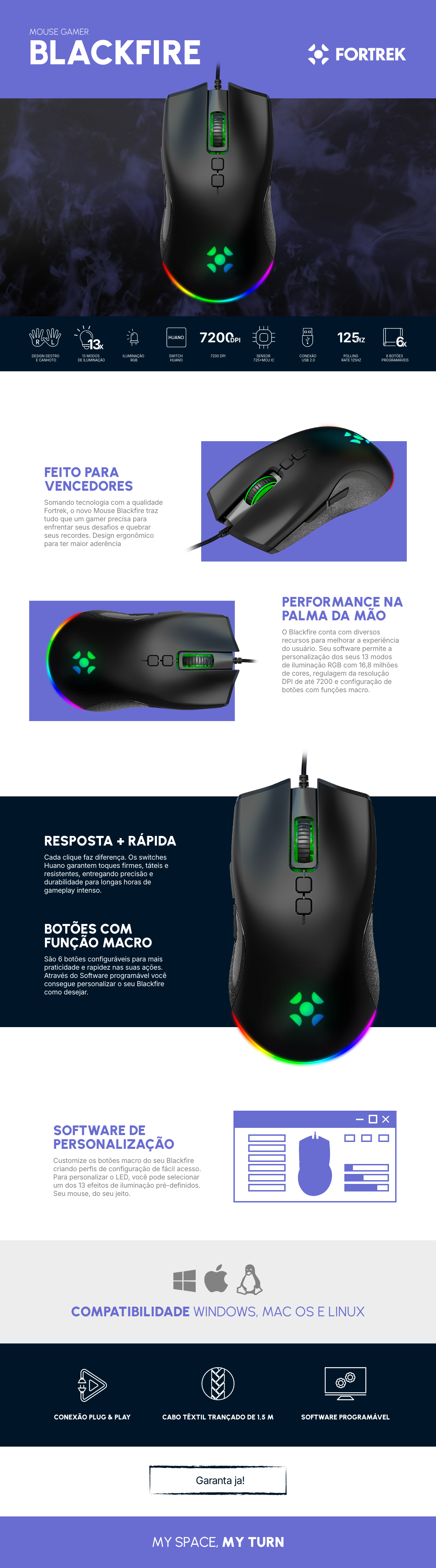 Apresentando um LED RGB conta com capacidade de 13 modos de iluminação e switch Huano. O mouse Blackfire é construído com plástico ABS de alta resistência e acabamento UV, 6 botões de comandos + Scroll em silicone para adicionar mais aderência ao toque. O modelo alcança até 7.200dpi oferecendo agilidade e precisão em rápidos movimentos. Inclui um software avançado para personalizar o dispositivo de acordo com seus desejos, por esse software é possível personalizar script de macro, atribuição de botão, iluminação, configurações de modo e salvar perfis em seu computador para acesso fácil e rápido.